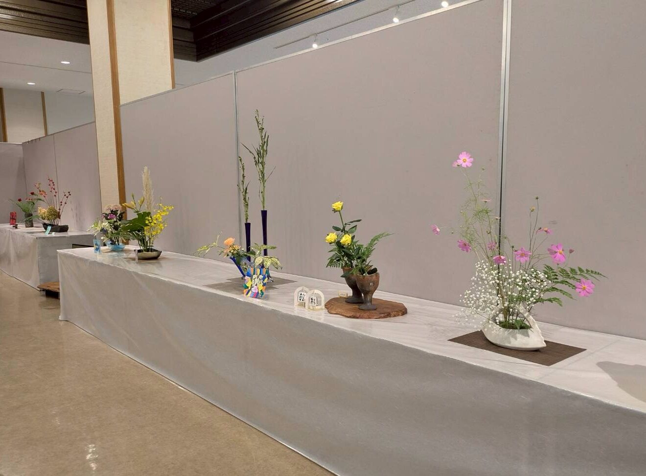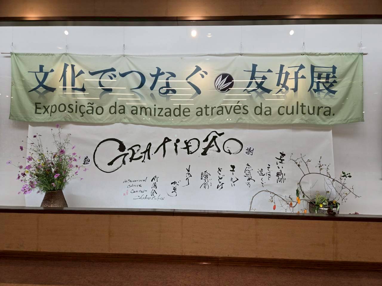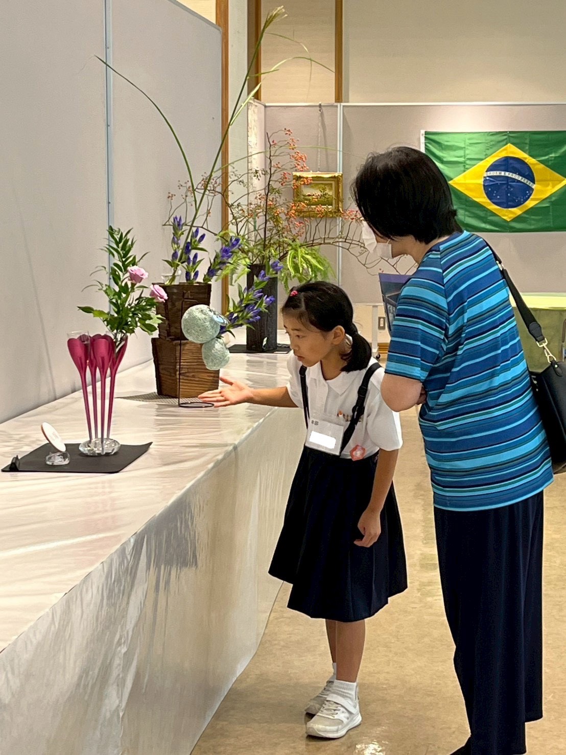 会場では、3歳から大人までの幅広い年齢の生け花作品や、書道作品、ブラジルとの友好活動の記録、大阪支部からの写真参加作品など、様々な展示をご覧いただきました。竹風会の生け花にはそれぞれ「テーマ」と「席札」があり、自由な発想で取り組んでいます。